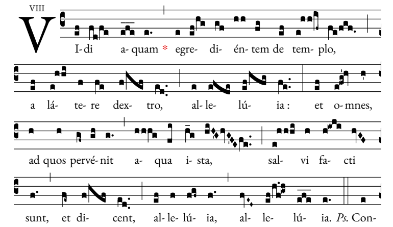 Vidi aquam egredientem de templo, a latere dextro, alleluja! 비디 아쿠암 에그레디엔뗌 데 뗌쁠로 아 라떼레 덱쓰뜨로 알렐루야; 성전 오른편에서 흘러내리는 물을 보았노라. 알렐루야! (부활시기 성수예식 안티폰;에제키엘 47장 및 시편 117 참조)