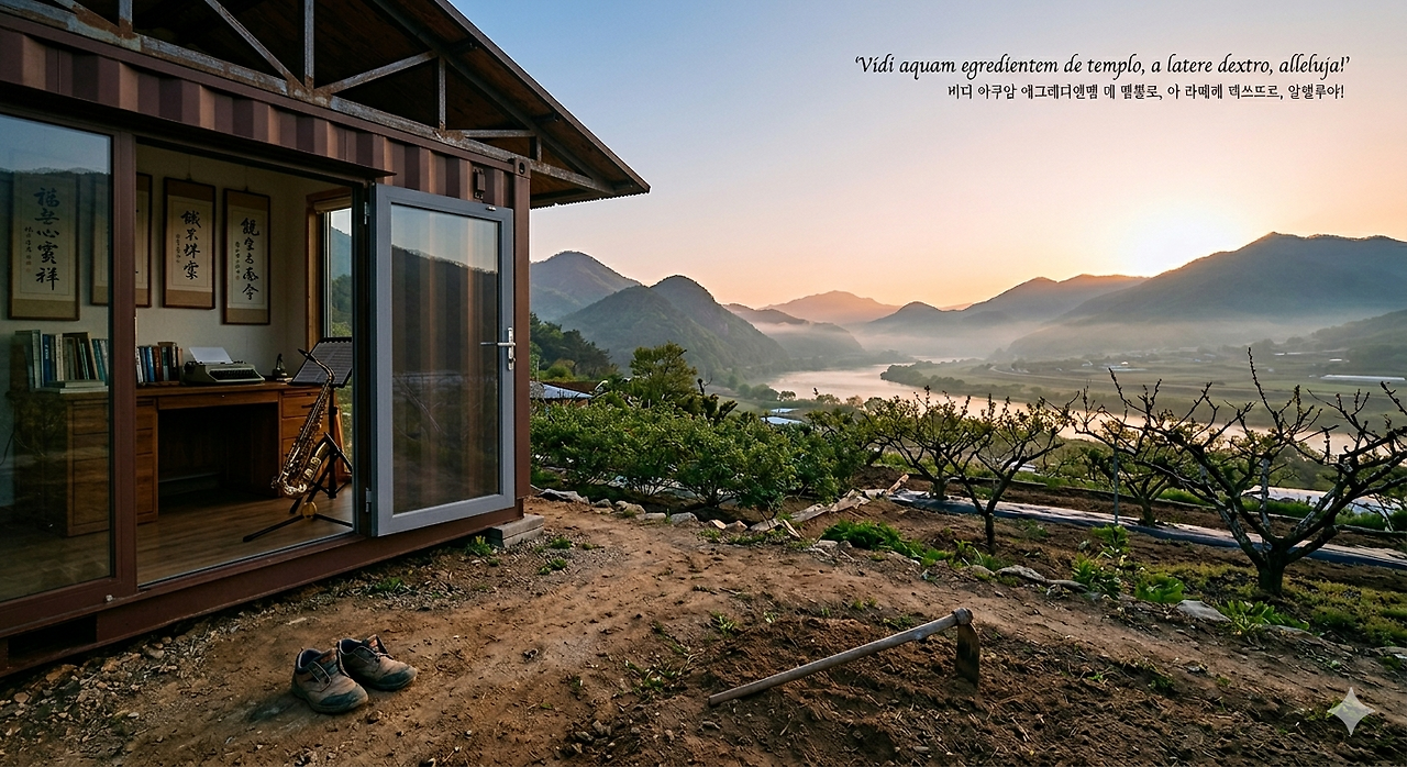 나의 새로운 성전은 지리산 자락, 섬진강의 굽이진 길 끝에 자리한 나의 일상이다. 새벽안개가 길뫼재 마당을 덮을 때, 나는 낡은 작업복을 입고 흙 위에 선다. 이것이 나의 입당(入堂)이다. 거창한 성가 대신 소나무 사이를 지나는 바람 소리가 들려오고, 정제되지 않은 흙냄새가 향(香)이 되어 피어오른다.