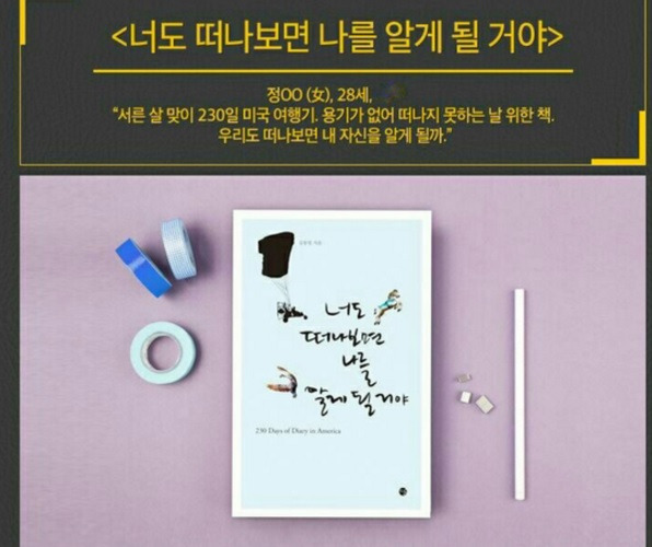 과거 친구는 나에게 "괜찮은 책 있으면 한 줄 평을 남겨달라"고 부탁했다. 어느 회사 블로그에 실리게 될 것이라는 이야기와 함께. 많은 책들이 있었지만 이 책을 다시 펼쳤고 난 친구에게 "서른 살 맞이 230일 미국 여행기. 용기가 없어 떠나지 못하는 날 위한 책. 우리도 떠나보면 나 자신을 알게 될까"라고 남겼다.