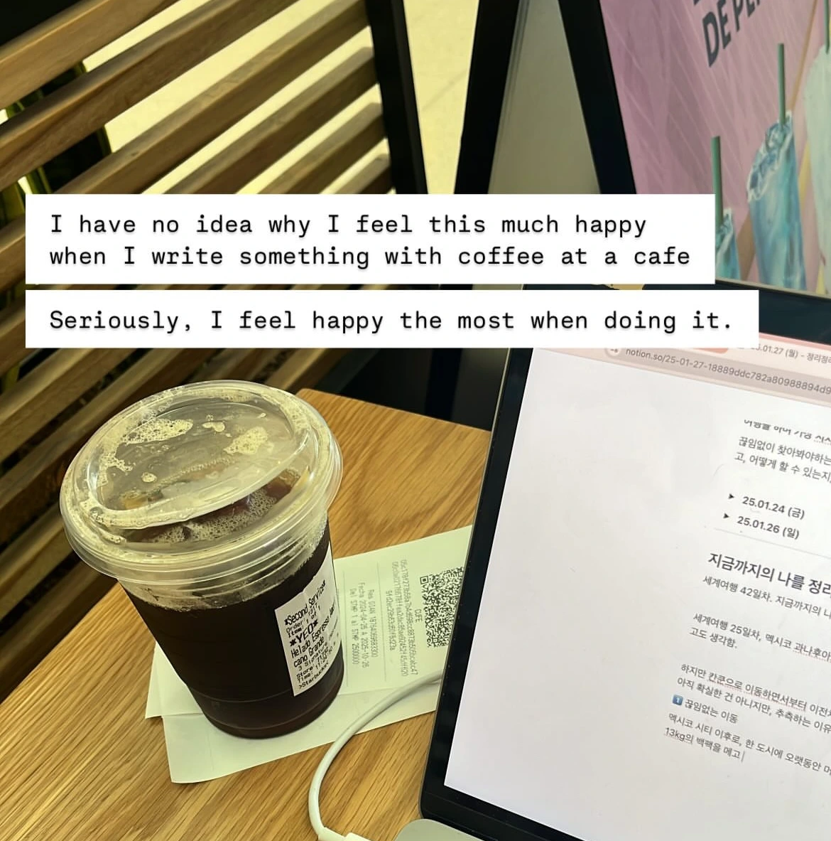 여행이 길어지며 지쳐갈 때쯤, 스스로가 마음껏 하고 싶은 것을 하도록 내버려두었다. 여행에 대한 압박이 사라진 나는 매일 아침 카페에서 글을 썼다. 카페에서 뭉쳐있는 생각 실타래를 차근히 풀어낼 때 고양감이 들었다. 글을 사랑한다는 것을 알게 됐다.