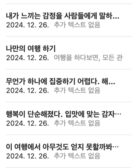 그렇게 불안하고 혼란스러웠기에, 이 세계여행에서 무언가를 얻고 오기를 바랐다. 나를 더 잘 알게 되기를. 가슴 뛰는 일을 찾게 되기를. 조금 더 단단해지기를. 앞으로 나아갈 방향을 발견하게 되기를. 그래서 여행 초반엔, 스쳐가는 생각 하나조차도 놓치지 않으려 애썼다. 혹시라도 중요한 깨달음을 흘려보낼까봐, 불안한 마음으로 모든 생각을 메모했다. 그 불안함은, 2023년 12월 26일. 단 하루 동안 내가 적어둔 10개의 메모 속에 고스란히 담겨 있다.