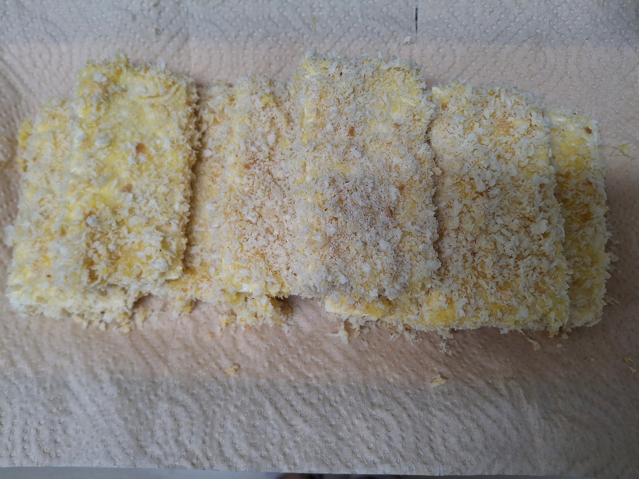 전분가루 뿌리고 달걀물 입혀 집에 남은 튀김가루를 꾹꾹 눌렀다.
