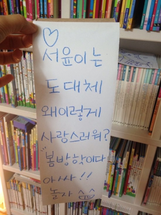 편지 좋아하는 나는 당연히 내 아이들에게 수시로 쪽지를 날리고 도시락 편지를 보내고 침대에 편지를 붙여놓고 보드판에 편지를 써놔.