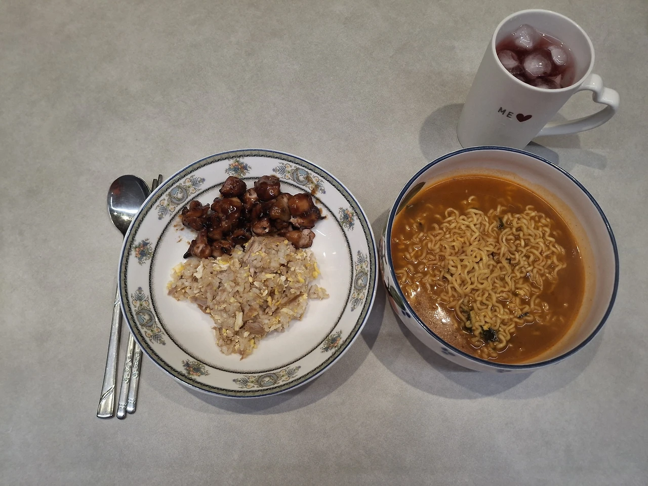 달걀 볶음밥에 닭고기 데리야키 올려 라면도 하나 내어주고
