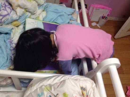 침대 난간에 반쯤 매달려서 왜 굳이.. 책을 봐야 하는 걸까.