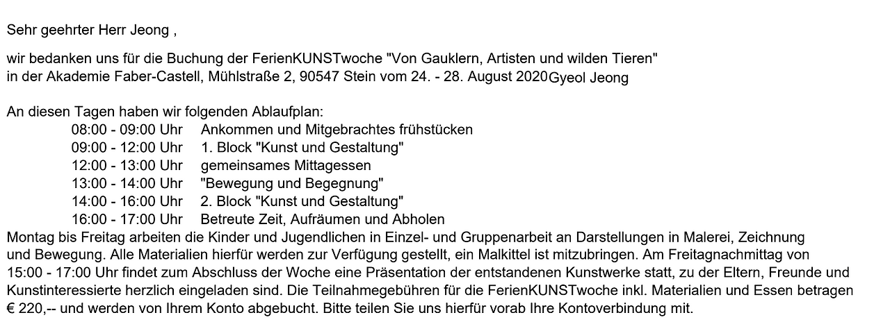 이 지난한 과정을 밟던 중이다 보니 두어달 전 예약한 딸아이 파버카스텔 아카데미를 취소할까도 생각했었다. 아침마다 40분 거리를 데려다 줘야 하기 때문이다. 차 없이 대중교통으로 아이를 데려다 주고 돌아오는 일이 체력적으로 힘들 거라고 생각했다. 현재 우리가 살고 있는 뉘른베르크에서 함부르크까지는 밤샘 Flix 버스 타고 8시간 정도 걸린다. 한 번 다녀오면 사나흘은 몸이 아프다.