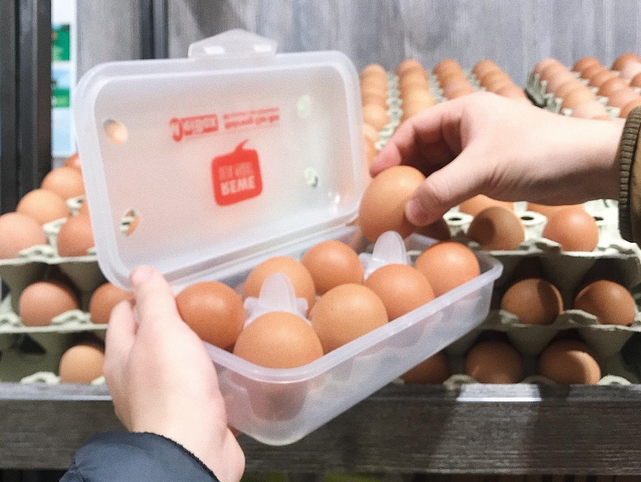 무포장으로 달걀 사기. 매장에 구비되어 있는 재생 종이 케이스나 개인 달걀통에 담아 낱개씩 원하는 만큼 살 수 있어요.