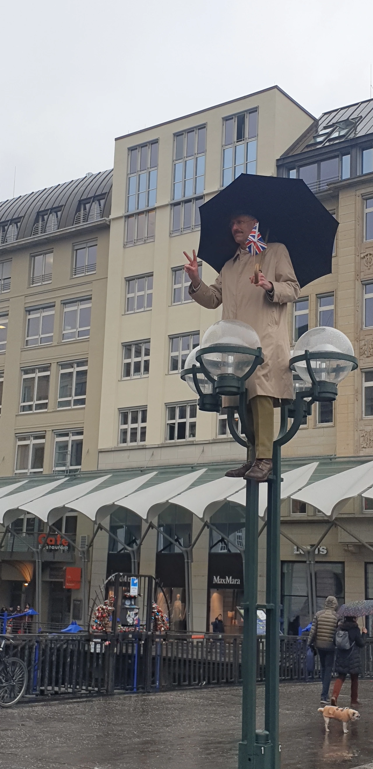 어느 날 시내에서 아내와 밥을 먹고 아내를 오피스에 데려다주던 참이었어요. 웬 르네 마그리트의 그림에서 튀어나온 듯한 버버리 코트의 아저씨가 저렇게 함부르크 시청 앞 광장 가로등에 올라가 있는 것 아니겠어요!