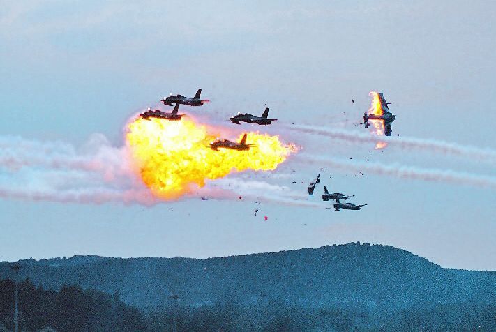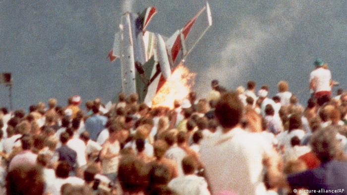 이탈리아 공군의 곡예 비행팀인 프레체 트리 콜로리가 하트모양을 그린 뒤 이를 관통하는 비행을 하다가 하트를 관통하는 역할을 하는 비행기 중 한 대가 다른 비행기와 충돌해 3대가 그대로 폭발하면서 추락했습니다. 당시 그 자리에 30만 명의 관중이 운집해 있었습니다.