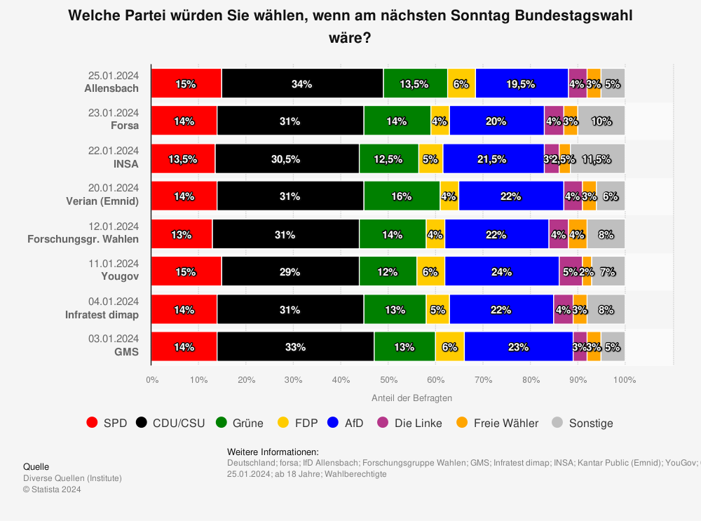 AfD의 당 대표는 그 비밀 모임에 참석한 고문을 해임해 어느 정도 자세를 낮추었지만, 그 자리에서 논의된 마스터 플랜을 부인하지 않고 있습니다. 그게 그들이 표방하는 정확한 입장이기 때문입니다. 지지율까지 집권당인 SPD를 넘어서 2위를 달리고 있는 만큼 그 어느 때보다 자신감이 넘치는 모습입니다. '당장 이번 주 일요일에 총선을 치른다면 어느 정당을 찍겠는가' 설문 결과를 종합한 스태티스타 자료를 보면 모든 여론 조사 기관에서 AfD는 20~24%의 지지율로 1위 CDU/CSU의 뒤를 바짝 쫓고 있습니다.