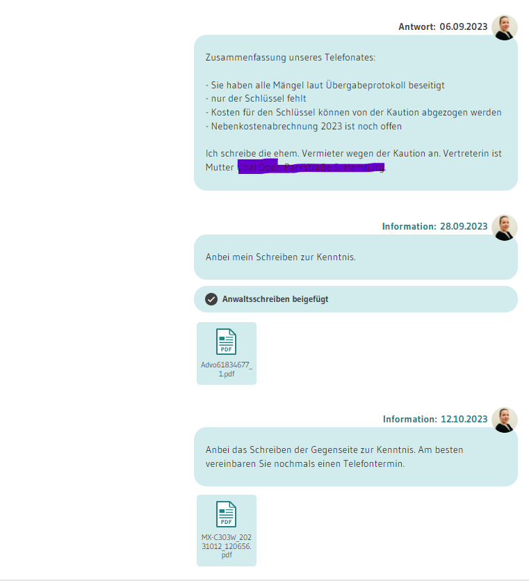 그 뒤로는 변호사 보험에서 운영하는 상담 포털에 제 소명 자료를 PDF로 만들어 올리고 피드백을 주면 됩니다. 이때부터 모든 건 변호사와의 채팅으로 상담이 전환됩니다. 변호사가 집주인에게 편지를, 집주인 측이 변호사에게 답장을 보냅니다. 그러면 저희 변호사는 그걸 스캔해 우리 채팅창에 올려줍니다. 제가 더 반박할 거리를 제공하거나, 추가 증거를 제공하면 그걸 바탕으로 우리 변호사는 다시 집주인에게 재반박 편지를 보냅니다.