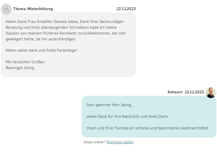 사이다 2백만 캔을 들이켠 것 같은 청량감이 들었습니다. 제가 독일 법조문을 일일이 들춰보지 않고도 집주인의 궤변에 깔끔하게 반박할 수 있다니, 너무 신선하고 감사했습니다. 이윽고 집주인을 꼬리를 내렸고 보증금을 고스란히 돌려주었습니다.