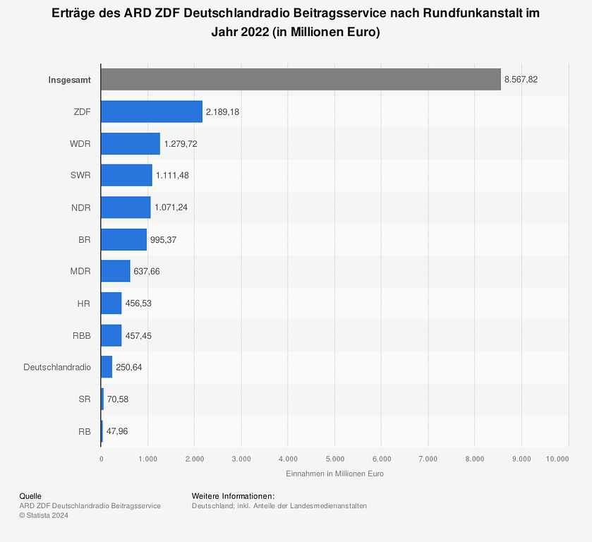 지역 거점 방송국까지 모두 합친 수신료 액수. 85억 6천 7백만 유로. 출처: 스태티스타