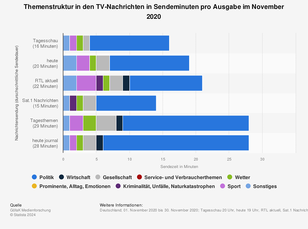 2020년 11월 기준 독일 메인 방송 뉴스의 뉴스 주제 범위. 어느 방송이든 정치 꼭지가 압도적이다. 출처: 스태티스
