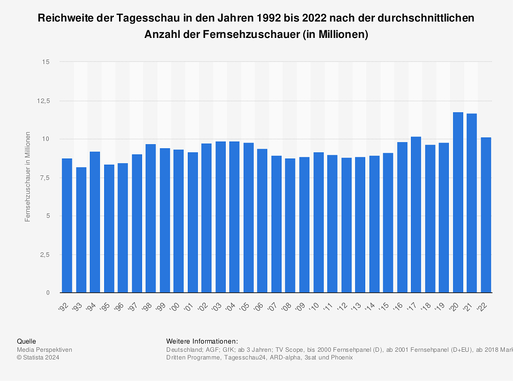 스태티스타 자료를 보면 2022년 기준 평균 시청자수가 1천만 명이 넘는데요. 전체 8천4백만 인구의 12% 수준이고, 모집단을 TV 보유 가구수에서 계산하면 시청 점유율이 40% 수준입니다. 굉장히 높은 편입니다. 신뢰도 역시 높은데요. 설문조사를 돌려보면 제1공영방송 ARD의 타게스샤우가 부동의 1위, 제2공영방송 ZDF의 호이테가 2위를 놓치지 않습니다.