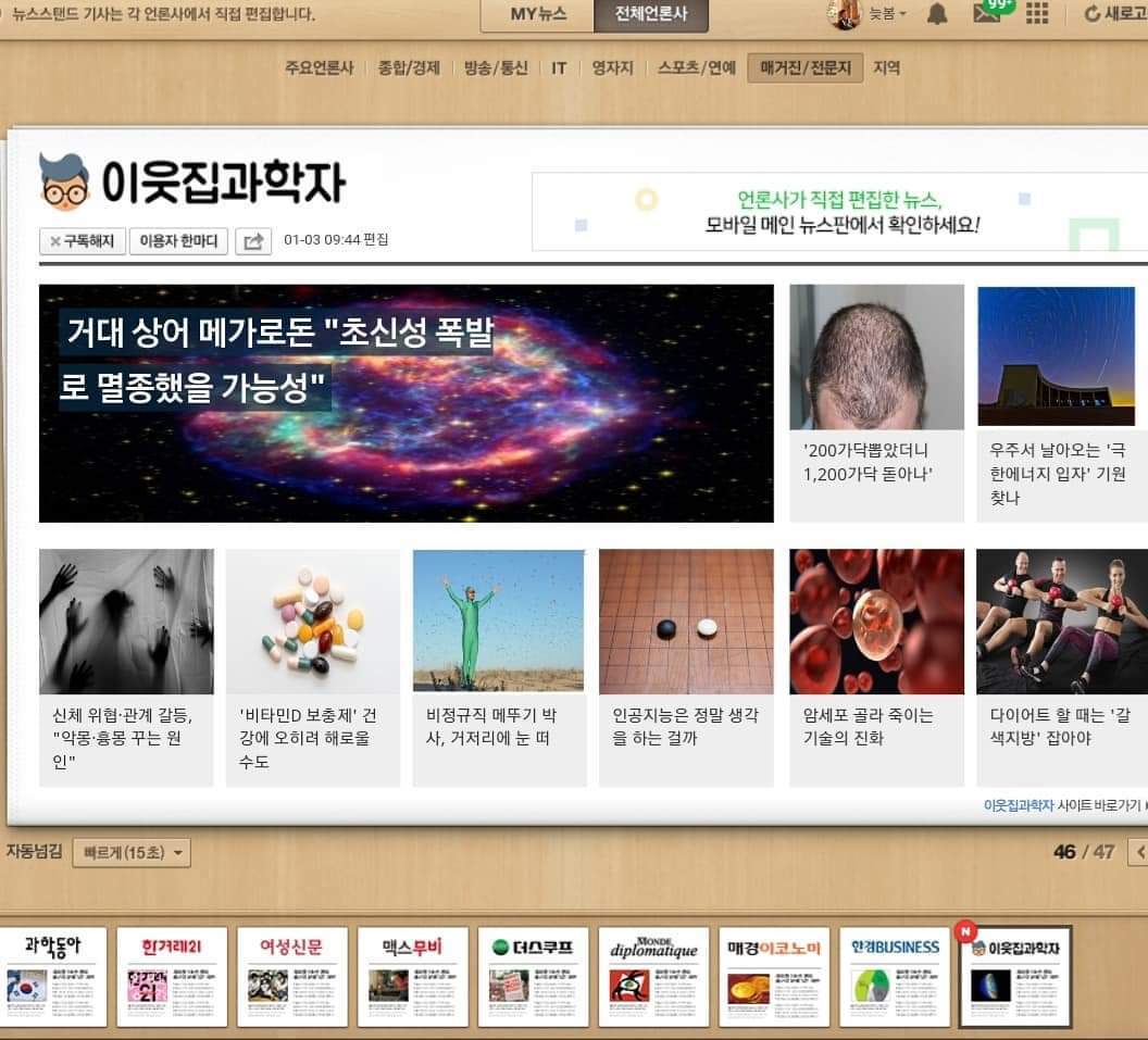 지난해 잊지 못할 순간 중 하나가 바로 <이웃집과학자>의 네이버 뉴스스탠드 진출이다. <이웃집과학자>는 천문학자인 내 친구와 내가 손잡고 설립한 회사다. 난 편집권•인사권을 가지고 회사의 실무를 책임진다. 대표이사인 친구는 회사를 경영하며 살림과 운영을 도맡았다. 2016년부터 일궈온 이 조그마한 회사가 벌써 만 3년차에 접어들었다.