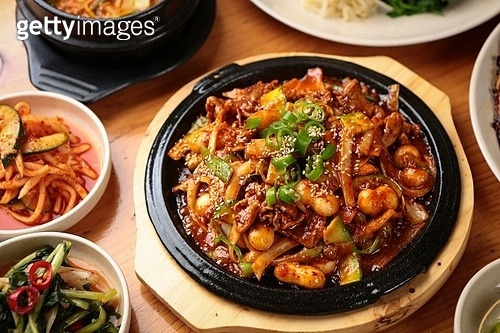 제육은 학교 앞 분식집에서 만들었다. 굉장히 달면서도 기분좋게 맵싹해서 우리가 항상 '마약 제육'이라 불렀다. 양념 색깔은 검붉은 색인데, 온갖 몸에 안 좋은 게 가득할 것 같지만 삽시간에 침이 고여버리는 비주얼이었다. 중독성이 강했다. 푸진 양은 덤이다.