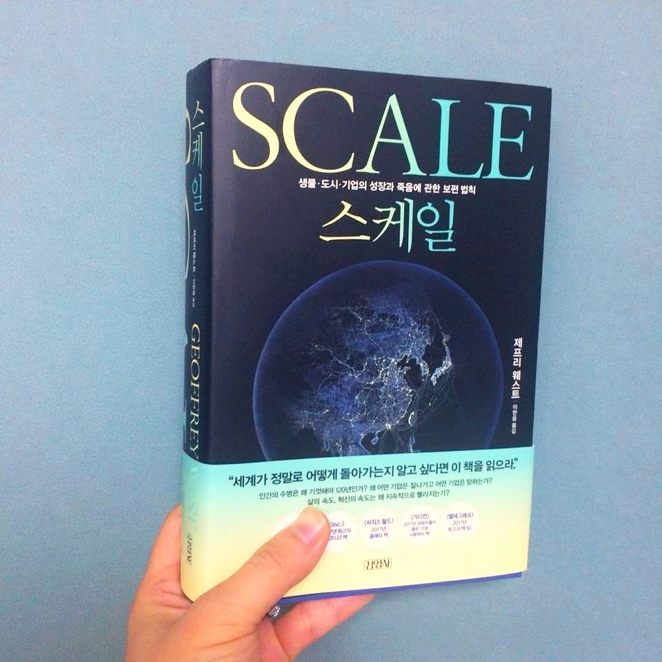 <스케일> 이라는 책은 제프리 웨스트라는 미국의 저명한 이론물리학자가 쓴 책이다. 그는 물리학의 여러 분야 중에서도 카오스 이론으로 유명한 복잡계 물리학의 대가이다. 복잡계 물리에서 연구하는 주제 중에 우리에게 친숙한 것은 “나비효과” 다. 복잡한 시스템 상에서 “나비효과” 가 어떻게 일어나는지 등을 연구하는 분야이다. <스케일> 에서 그는 복잡계 물리학의 한 방법론을 소개한다. 그것은 바로 스케일링 연구이다. 스케일링이란, 네트워크 구조를 가진 시스템에서 보여지는 특징 중에 하나라고 할 수 있는데, 겉으로 보기에 질적으로 다른 성질을 가진 시스템이라 하더라도 동일한 네트워크 구조를 가진 시스템들은 서로의 확대판, 축소판으로 볼 수 있다는 거다.