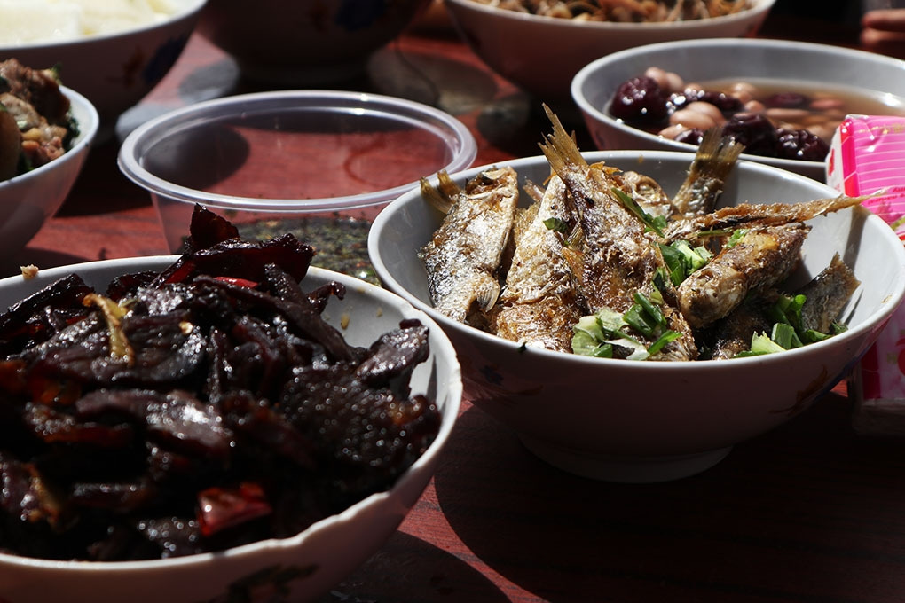 그릇에 담긴 작은 물고기 튀김에 관심을 보이자 할머니께서 메콩강(란창강)에서 잡은 거란다. 대부분 민물고기는 특유의 비린맛을 잡기 위해 향신료가 너무 많이 들어있어 먹기 힘들었는데 기름에 튀기고 대파만 뿌려져 있어 그렇게 비리지 않고 먹을만하다. 훈증한 소고기 볶음이 질긴 듯하면서 고소하니 맛있다. 한우는 없으니 들판에서 운동 많이 했을 물소겠지? 자연에서 온 깊으면서도 거친 맛을 많이 보는 여행길이다.