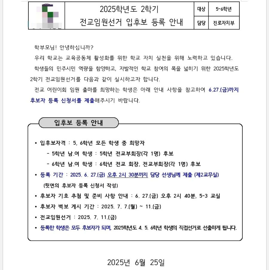 드디어 전교 임원선거 입후보 등록에 관한 공지가 올라왔어요.