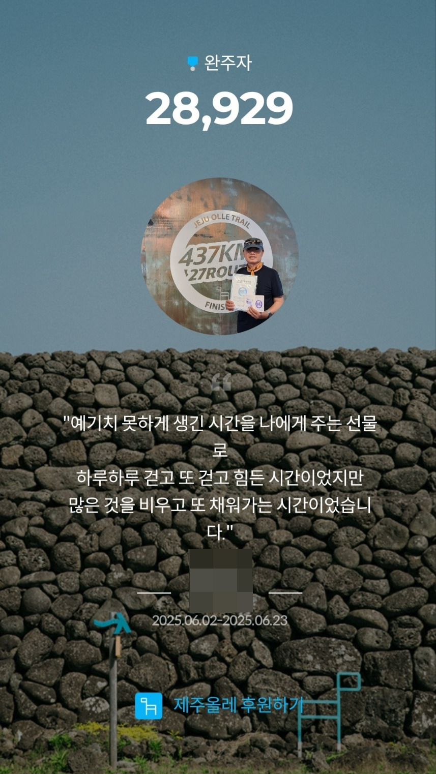 얼마 전에는 20여일 동안 제주 올레길을 물집이 터지는 상황에서도 완주하셔서 인증도 받으셨다.