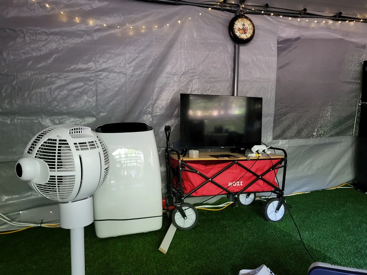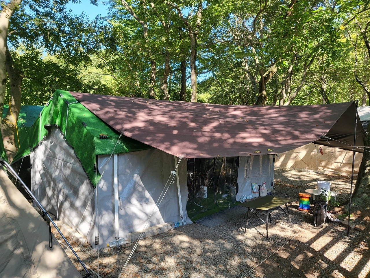 사천의 한 물놀이장에 위치한 장박지에 손수 텐트를 만드셨다.