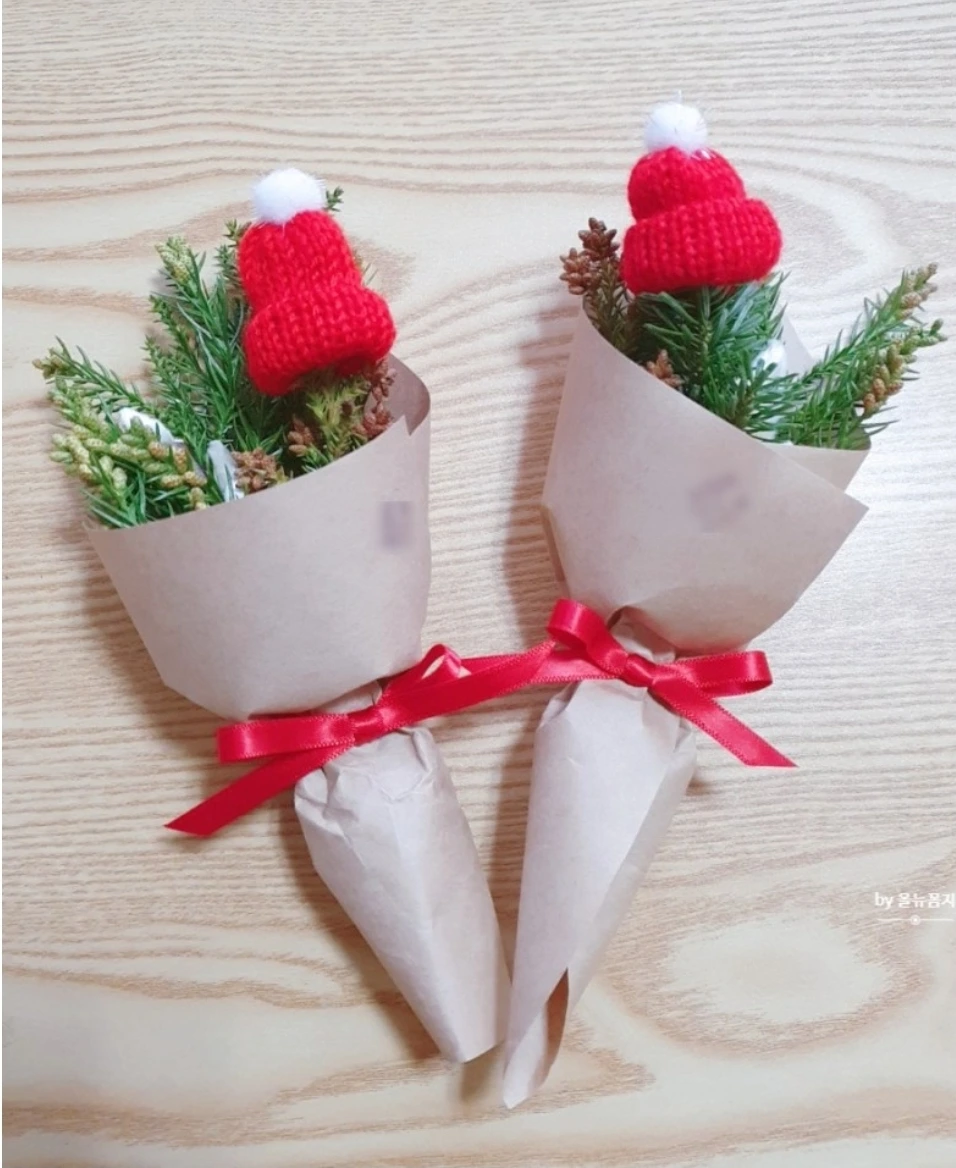 또 한 번은 점점 추워지고 코로나로 언제 왔는지도 모를 성탄절이 다가오는 것을 꽃집을 보면서 느끼고 있을 때였다. 꽃집에는 빨강, 초록 성탄절 분위기가 물씬 풍기고 있었다.나뭇가지에 귀여운 모자가 쓰인 것을 보고 아이들이 귀여워하며 지나다녔는데 하루는 이모가 빨강 모자가 있는 작은 다발을 선물로 주셨다. 안 그래도 귀여워했던 아이들이 너무 신나 했었다.