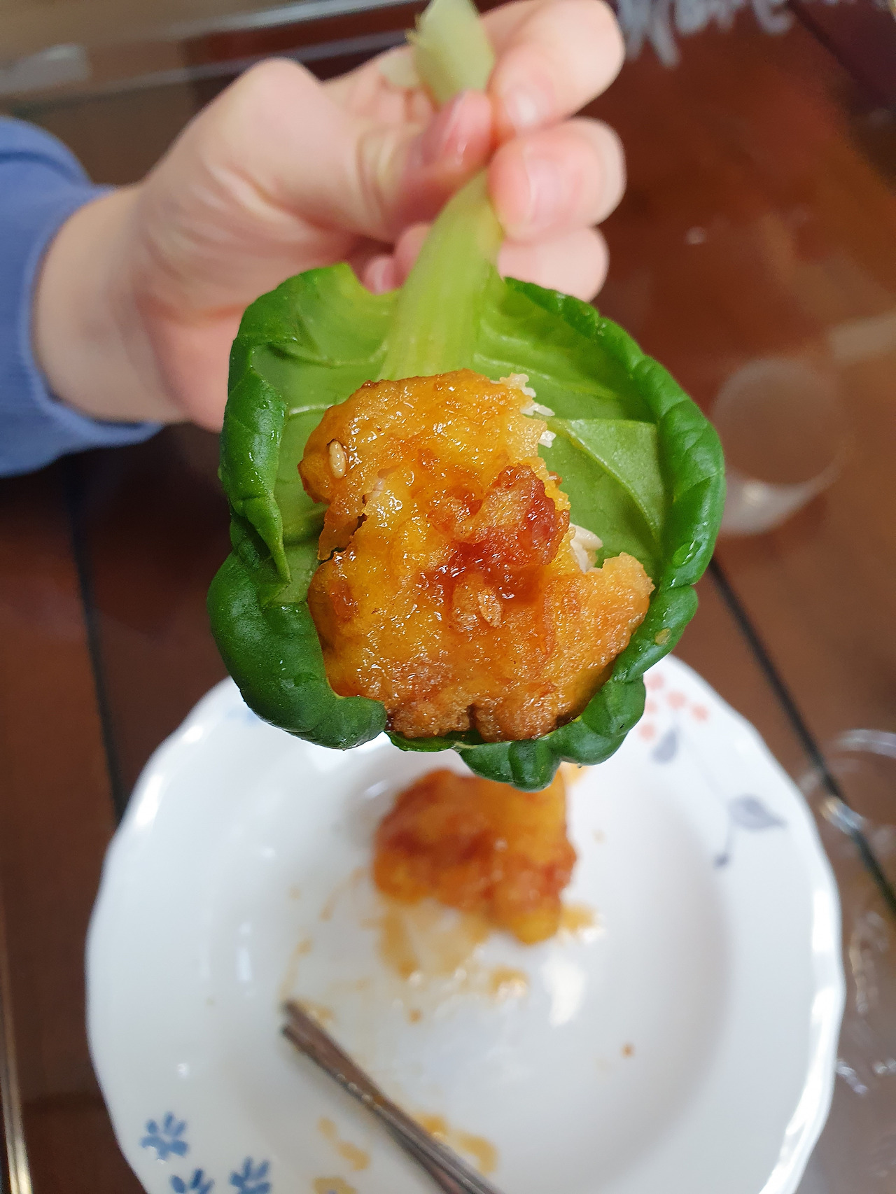 먼저 따끈하고 맛있게 보이는 치킨 한 조각을 쌈에 올려 싸먹어 보았다.
