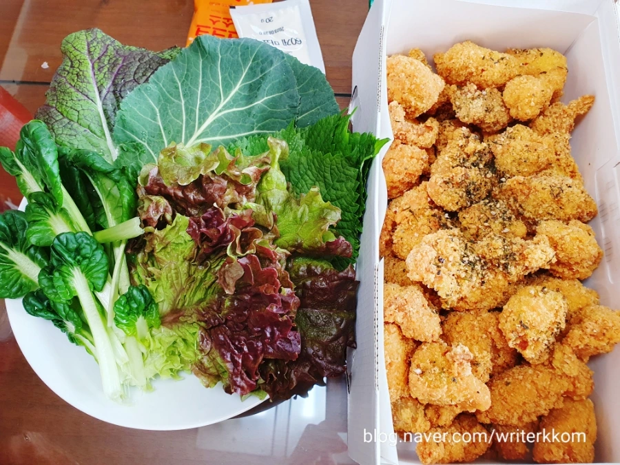 전혀 어울리지 않을 것 같았던 치킨과 쌈야채의 조합이었는데 생각 이상으로 맛있있었다.