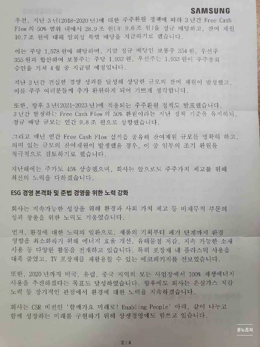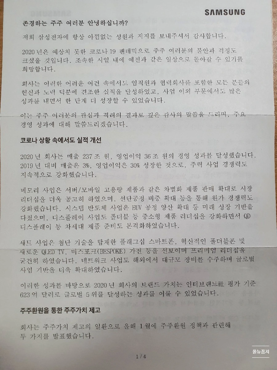 편지에는 어려운 코로나 상황 속에서도 매출 및 이익이 증가하였다는 이야기와 앞으로 열심히 노력하겠다는 내용이 있었어요.