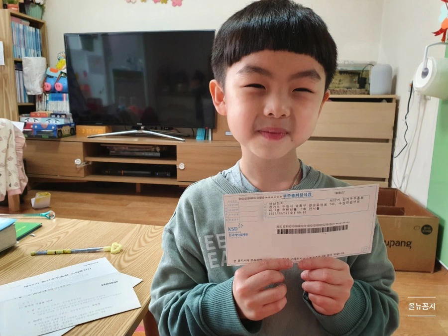 주주총회참석장에는 어디서 언제 주주총회가 열리는지 쓰여 있었는데요 평일이 아니라면 온라인 주주총회라도 보여주며 아이에게 좋은 경험을 시켜주고 싶었지만 초등학교에 입학한 지 얼마 되지 않았고 수업을 빼기도 그래서 패스했어요.
