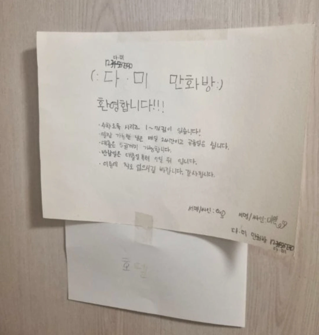 최근에는 <수학 도둑>을 중고로 사서 동생과 함께 2회독까지 했는데요 아이들은 많은 책이 한꺼번에 오자 방문 앞에 '만화방'이라고 쓰며 시간이 가는 줄 모르게 재미있게 읽었어요.