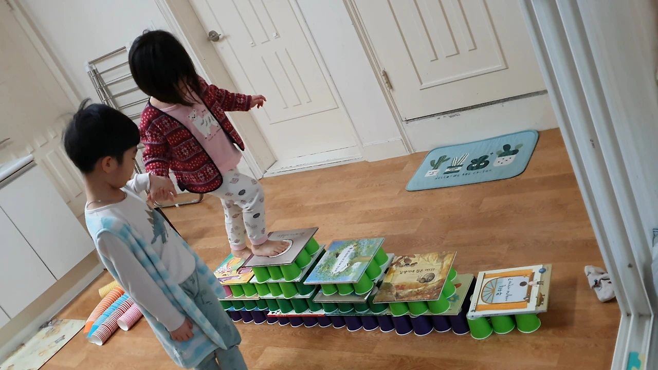 덕분에 아이들은 책을 많이 물려받았는데요 거실에 큰 책장을 두고 여러 책들을 꽂아놓아두면 심심할 때 한 권씩 꺼내서 보기도 하고 책을 쌓아 놀이를 하기도 했어요.
