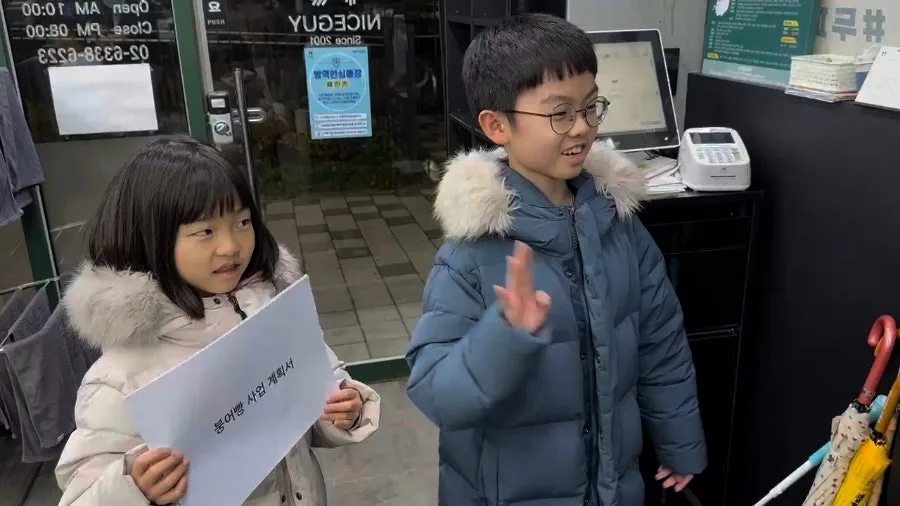 마침 아빠가 영상으로 찍어 놓아서 당시 상황을 볼 수 있었는데요 따라간 동생이 오빠 옆에 서서 사업 계획서를 들고 프레젠테이션을 돕고 아들은 처음 보는 사장님 앞에서도 떨지 않고 또박또박 준비한 내용을 잘 발표했더라구요.