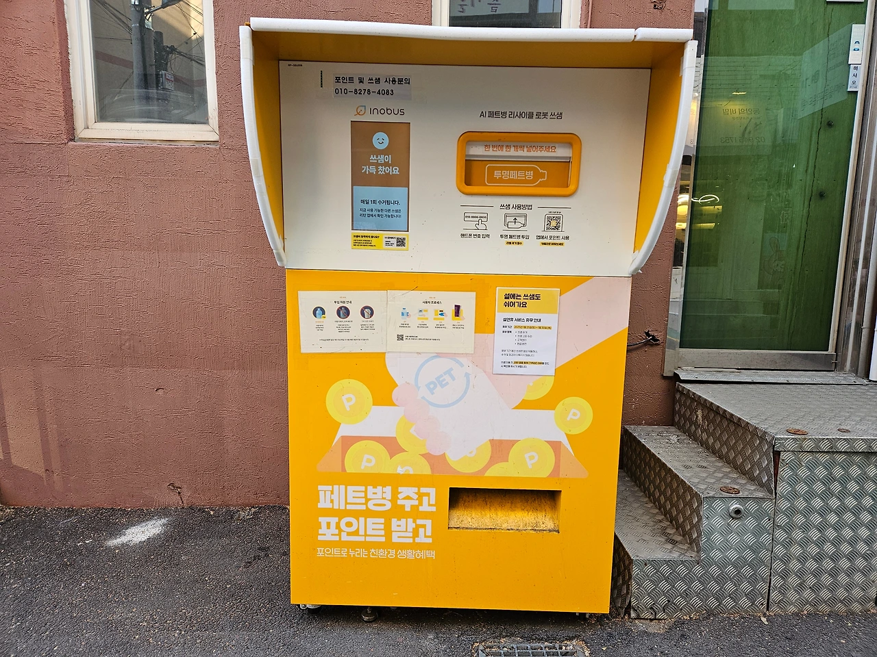 페트병을 하나씩 넣을 때마다 100원씩 적립해 주는 기계였는데 자치구나 동에서 실시하는 공공사업의 일환인 것 같았어요.