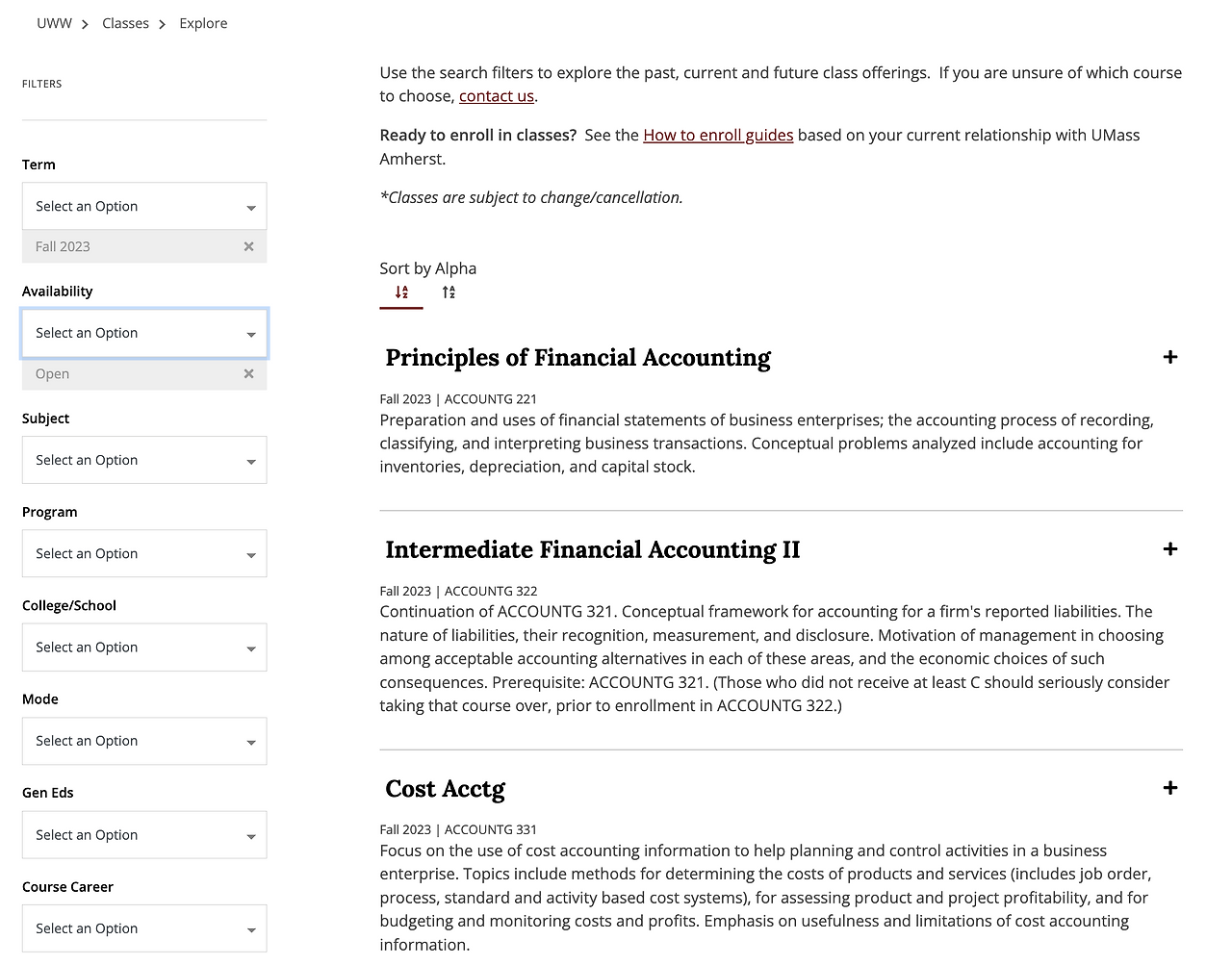 아래 사진은 umass amherst visiting student program이라고 검색한 결과에서 course search를 할 수 있는 방법이다.