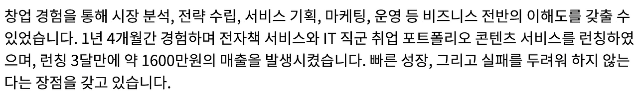 저는 스스로를 비즈니스에 강한 PM, 주도적이고 성장이 빠른 PM으로 설정했습니다. 창업팀에서 MVP 테스팅부터 정식서비스 런칭, 피보팅 등 서비스를 A부터 Z까지 만들어가는 것을 경험했습니다. 또한 체계가 전혀 없었고 인력이 부족했기 때문에 전략, 서비스 기획, 영업, 마케팅, 콘텐츠 제작, CS 등 대부분의 업무를 도맡아서 진행했습니다. 프로덕트 팀에서 전문적으로 PM일을 하신 분들에 비해서는 경쟁력이 부족한 것은 맞지만, PM 업무도 범위가 넓기 때문에 창업 경험을 통해 다양한 업무를 경험했다, 빠른 성장이 가능하다를 제 어필포인트로 세웠습니다.