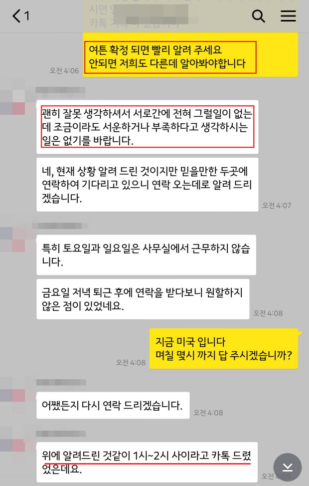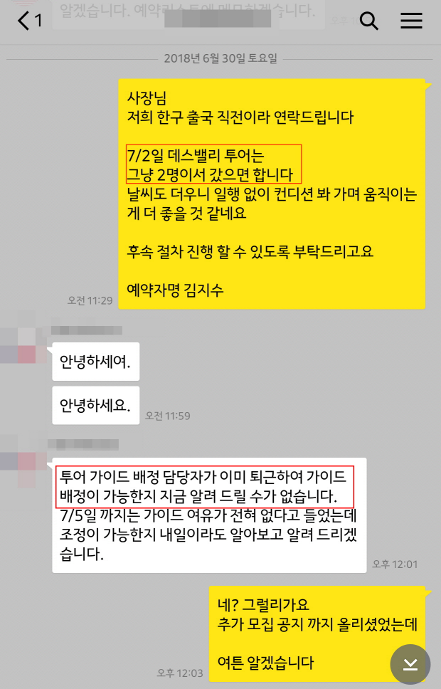 여행사 : 카톡에 남겼는데요. 1~2시간 후 까지 알아보겠다고. (머리 뚜껑 열림)