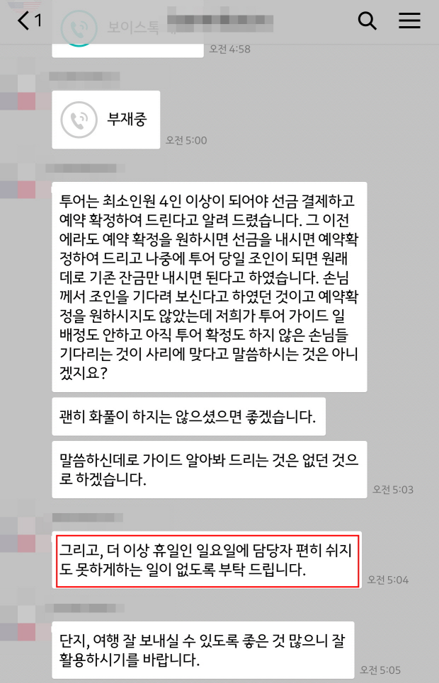 여행사 : 블라블라블라. 휴일인 일요일에 쉬지도 못하게 괴롭히지 말라. (이런 썩을...)