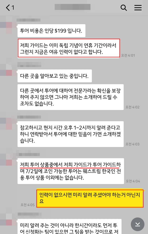 여행사 : 여기는 독립기념일 휴일 시즌. 가이드가 현재 배정될 수 없음.