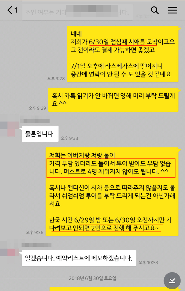 나 : 6/30일 출국인데 그때까지 확정이 안되면 저희 두명만 떠날게요