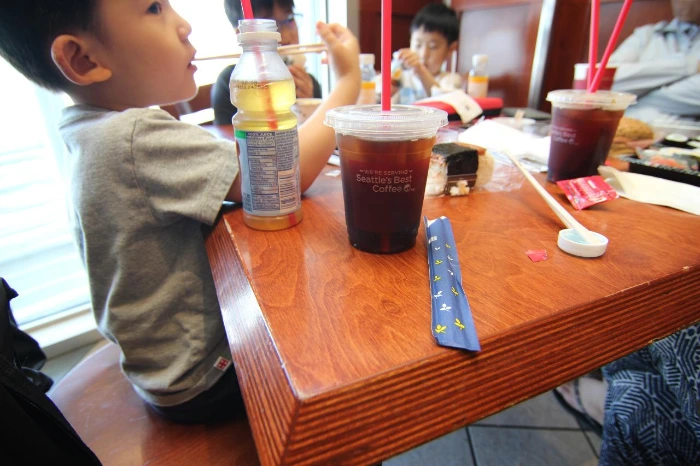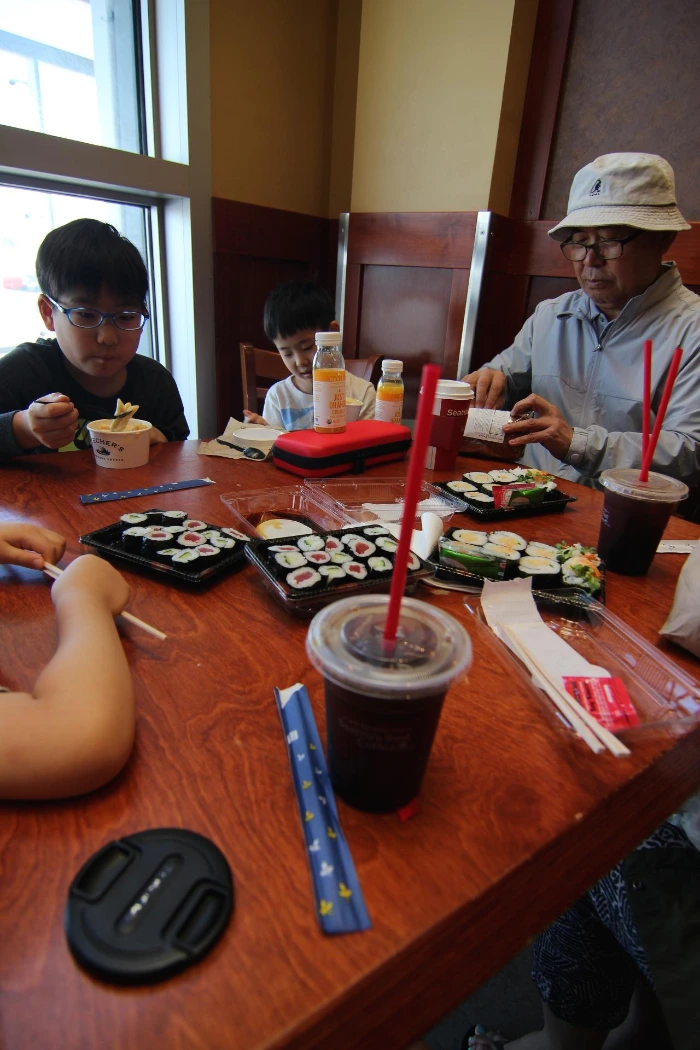 수속을 마치니 배가 고파 온다. 온통 햄버거, 커피, 빵 가게 밖에 없다. 멕시코 음식점도 물론있다. 그냥 Skip하고 싶었는데, 아이들도 배고프고 무엇을 먹을까 고민하다, 아버지께서 일본 음식점을 찾아내어 먼거리를 쉬지도 않고 전진해 가신다. 주먹밥과 삼각김밥 등을 한가득 사오셨다. 그런데, 먹을 곳이 마땅치 않다. 할 수 없이 커피샵에서 커피를 여러잔 사고, 동막골 계곡물 평상위에서 자리를 깔고 앉 듯, 커피샵에서 가장 큰 테이블을 점령하여 안방처럼 편하게 앉아 식사를 마쳤다.