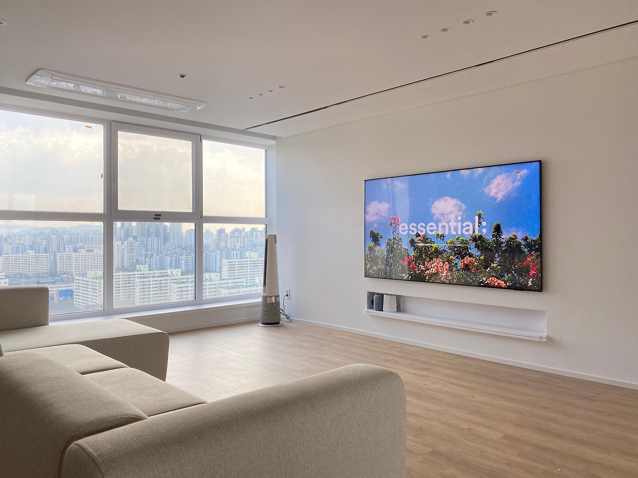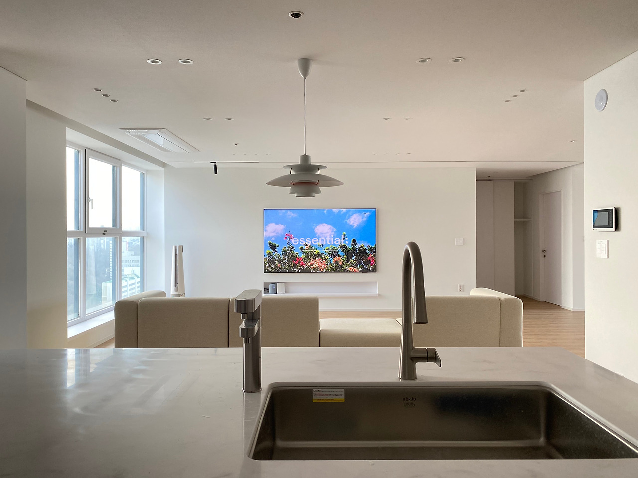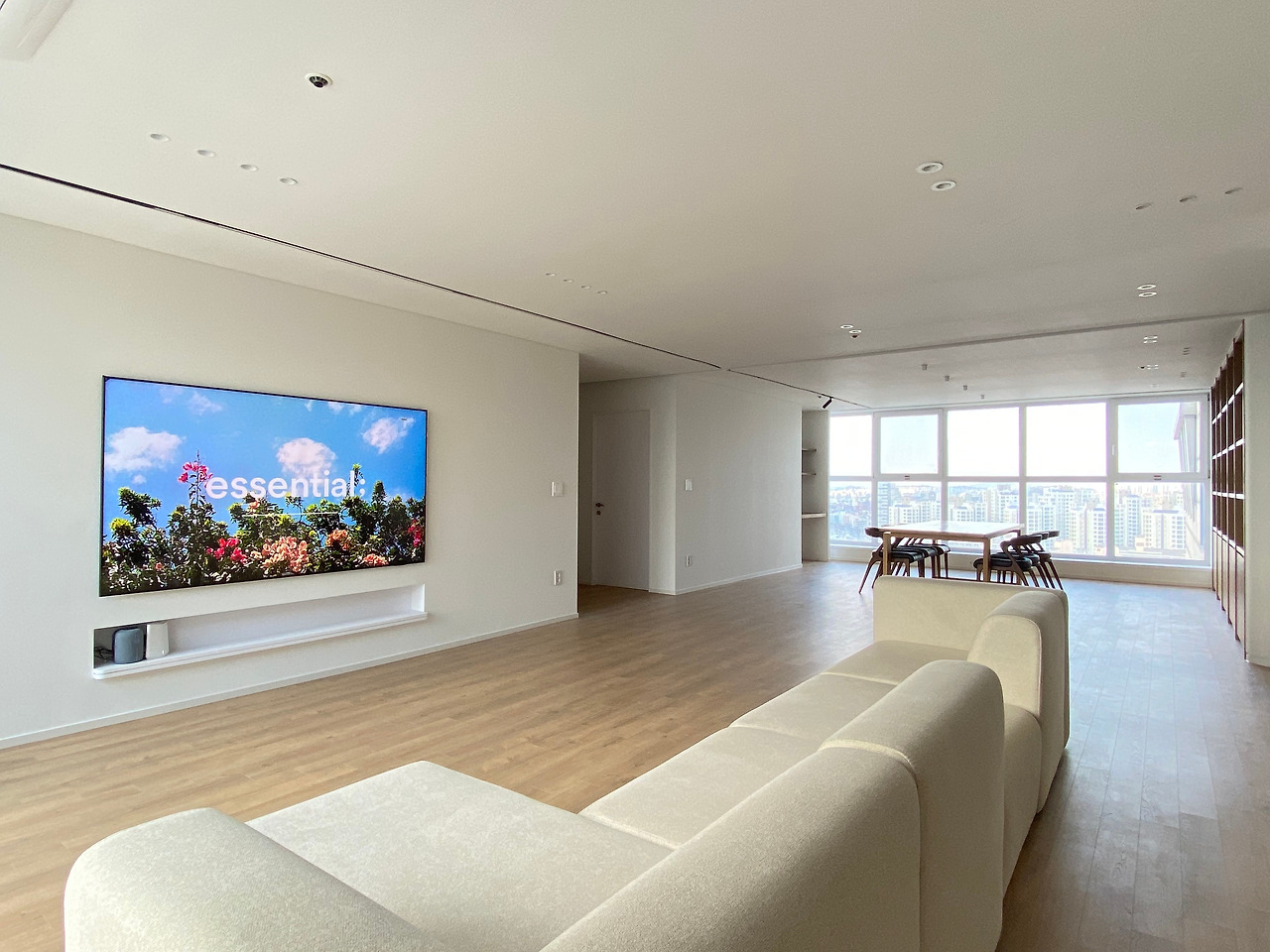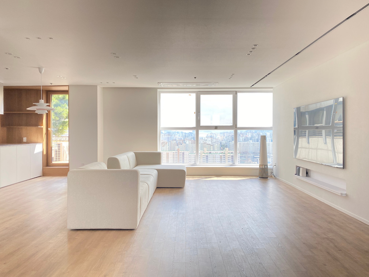 거실의 포인트는 넓은 개방감입니다. 발코니를 모두 철거/확장했고, TV는 85인치를 구매해서 브래킷 깊이만큼 매립했습니다. TV매립을 위해서 안방/거실 벽면을 전면으로 10cm가량 가벽을 추가 설치했습니다. 거실 창호 새시는 화이트 인테리어 필름으로 꼼꼼하게 마감했고 에어컨은 시스템 에어컨을 설치했습니다.