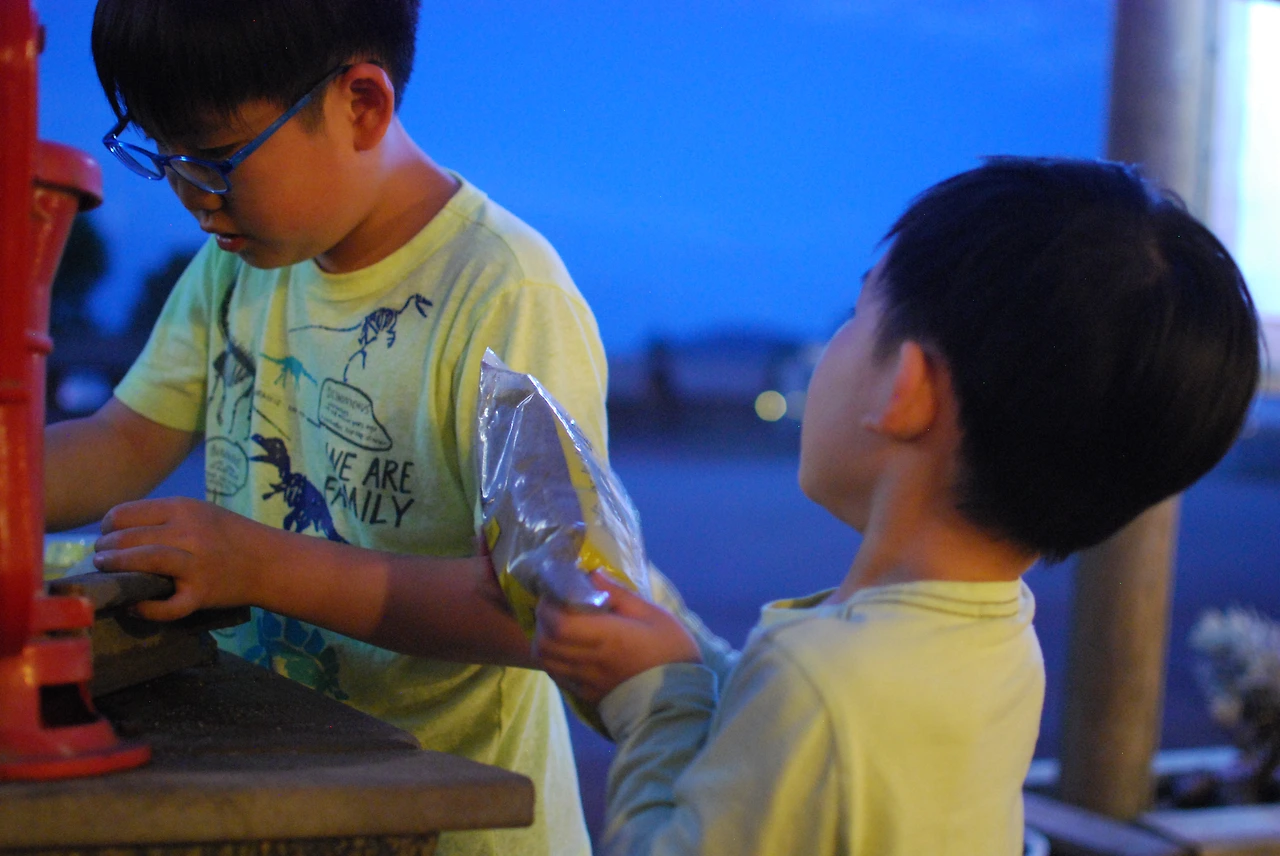 수영장도 문을 닫았고, 자전거 등은 당연히 탈 수도 없으며, 놀이터도 너무 늦어서 잠깐 밖에 놀 수 없는 상황이 되어 버렸다. 하지만 여기의 자랑(?) 거리 중하나라고 하는 '보석 캐기' 놀이 하나로 아이들의 욕구를 달랜다.