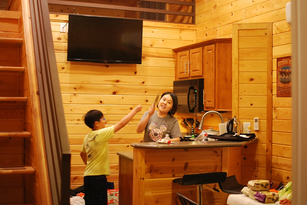 체크인을 하고 우리가 묵을 숙소, 'Deluxe Cabin'은 얼핏 봐서는 '상대적인 기준에서 Deluxe'한 것 같다. 밖에서 보니 미국 시골에서나 볼 수 있는 통나무 집 정도 되겠다. 하지만 내부 시설은 기대 이상이다.
