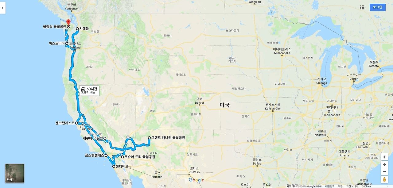 아버지가 알래스카에 갈 계획이라고 말했다는 것은 충분히 현실이 되고도 남을 일이었다. ‘삼대의 낭만은 개뿔, 서부여 안녕’하고서 여행 계획을 전면 수정해야 할 상황. 허탈했다. 여행 계획을 다시 짜볼까 하고는 구글 지도 웹사이트에 접속했다. 습관처럼 미국 서부 지역을 찾아 들어갔다. 정해진 것은 아무것도 없는데 내일 당장 여행을 떠날 사람처럼 클릭을 계속했다. 봐도 봐도 미국 서부에 미련이 남았다. 구글 지도를 탐닉하며 아쉬운 마음을 달래려 했지만 머릿속이 복잡했다.