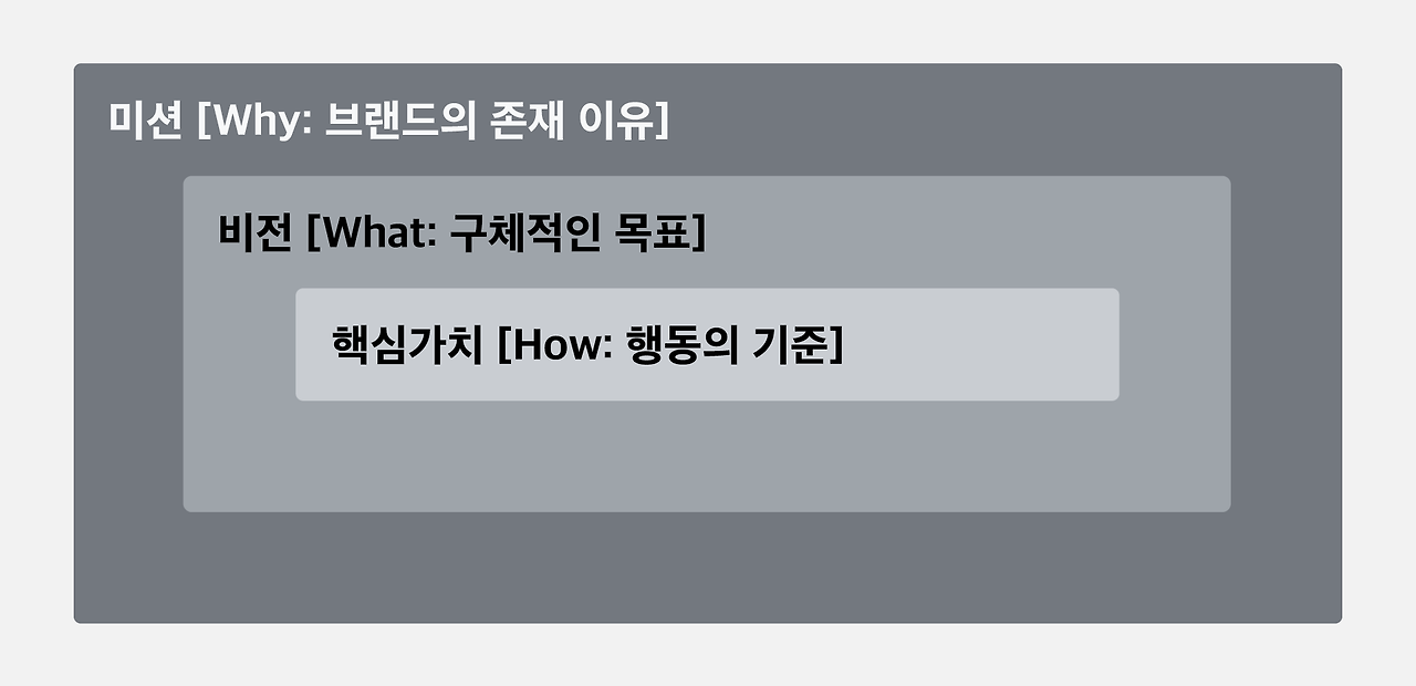 브랜드 분석 단계에서 미션을 정했다면, 이에 뒤따라 오는 구체적인 목표들을 정해야 합니다. 거시적으로 브랜드가 나아가야 할 방향성을 제시해주는 게 미션이라면, 이를 이룰 수 있도록 쪼개주는 역할을 비전과 핵심가치가 해준다고 볼 수 있겠네요.