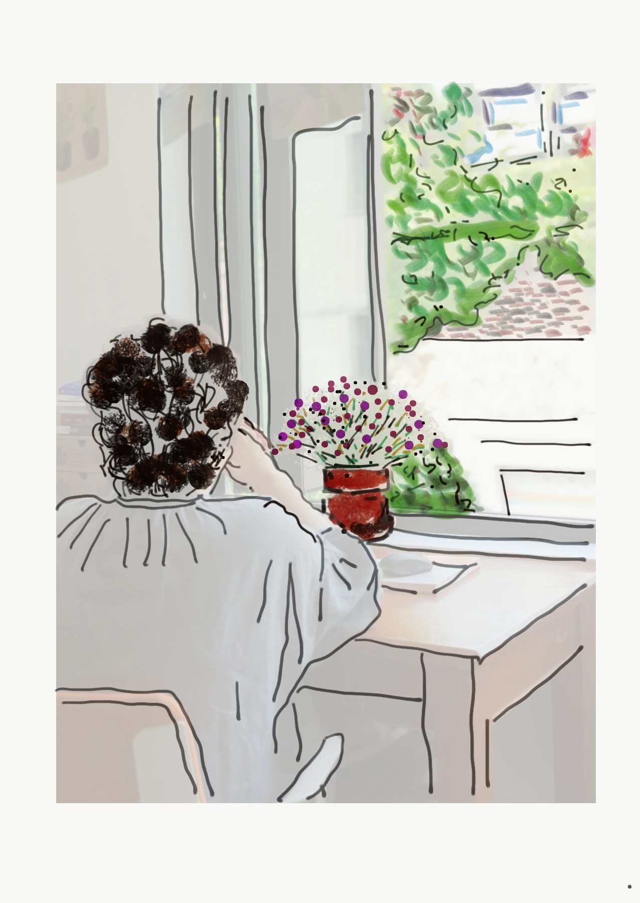 네 칸짜리 폴딩 창문을 열어젖히면 맞은편 경찰청 별장에서 초록 내 가득한 나무향을 준다. 봄에는 벚꽃이 흩날리고, 늦게 개화해서 미안한 개나리가 빼꼼 고개 내밀며 인사를 건네기도 하고 초록이 덥다 느껴지면, 빨간 장미꽃 만개한 그 경찰청 별장 정원의 붉은 향기가 나의 책상으로 내려앉는다. 이곳에서 그림을 그리고 상담을 하고 글을 쓴다.