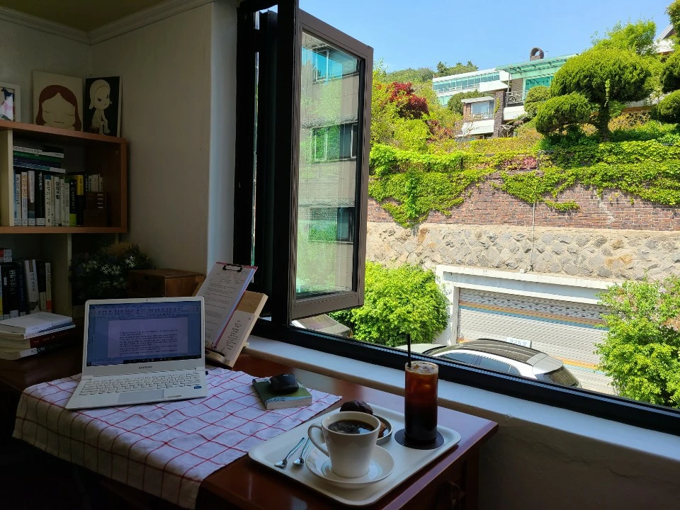 이미 유명한 공간이니, 이 공간에서 내가 제일 좋아하는 곳이 창가 책상이다.