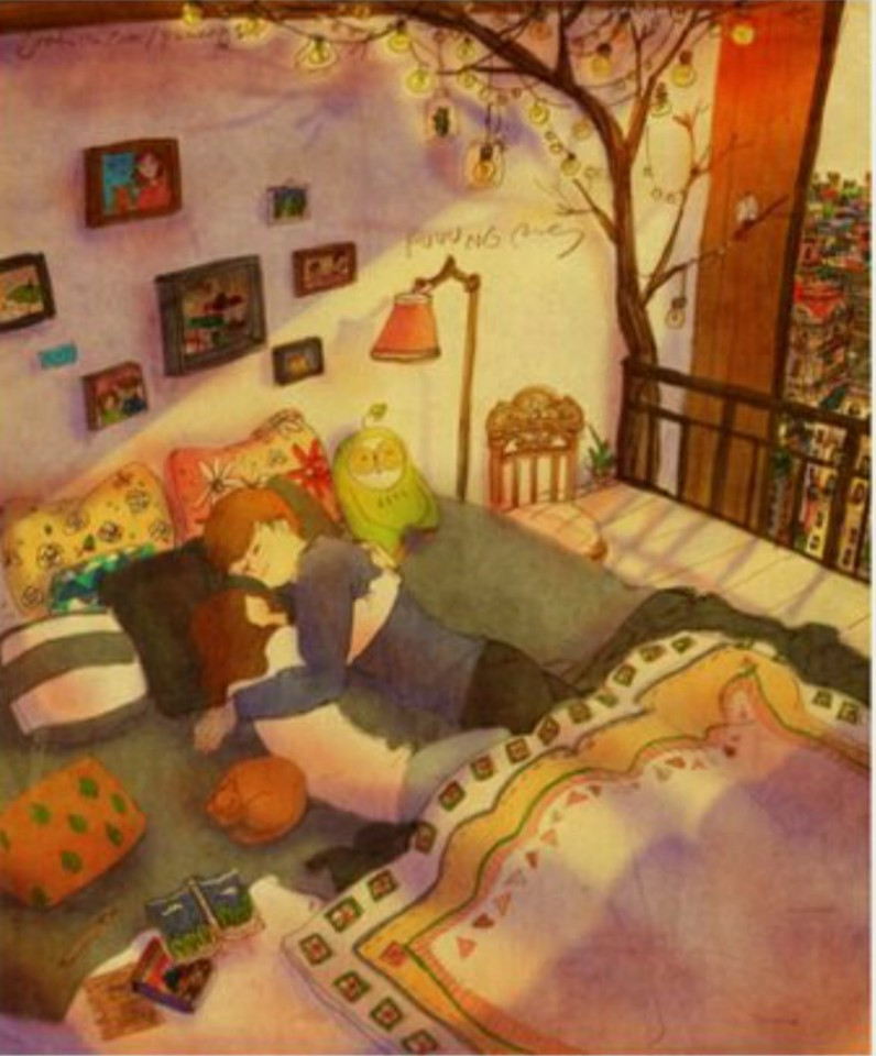 -선생님, 노력해 볼게요. 이 그림 속의 연인들처럼 해보려고요. 같이 요리하고, 안아주고, 침대에 누워서 뒹굴면서 남자 친구 엉덩이를 토닥토닥해주려고요.